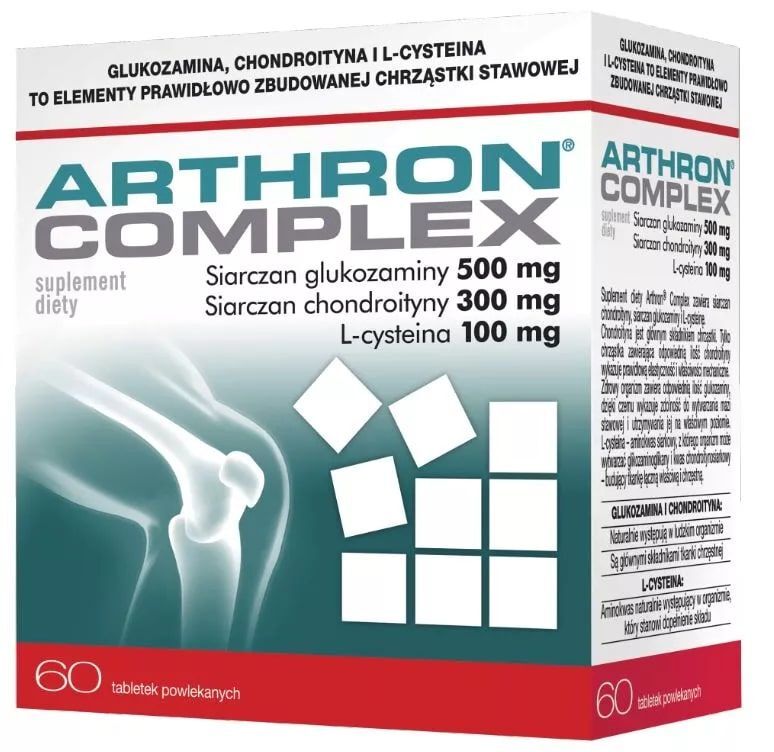 siarczan glukozaminy 2 KCI (ze skorupiaków), sól sodowa siarczanu chondroityny, chlorowodorek L-cysteiny, substancja wypełniająca - celuloza, stabilizator - poliwinylopolipirolidon, substancja wypełniająca - sól sodowa karboksymetylocelulozy usieciowana, dekstroza, substancja przeciwzbrylająca - sole magnezowe kwasów tłuszczowych, substancja glazurująca - alkohol poliwinylowy, substancja przeciwzbrylająca - dwutlenek krzemu, barwnik - dwutlenek tytanu, substancja glazurująca - glikol polietylenowy, substancja przeciwzbrylająca - talk, barwniki - tlenki i wodorotlenki żelaza, maltodekstryna.