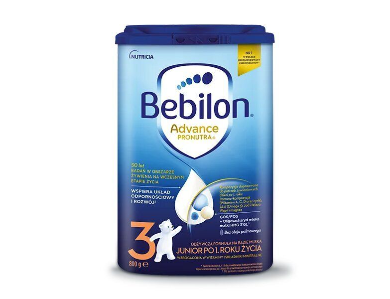 Dla zdrowia dziecka ważna jest urozmaicona i zbilansowana dieta oraz zdrowy tryb życia. Należy zwrócić uwagę na prawidłową higienę pierwszych ząbków, szczególnie przed snem. Bebilon 3 jest przeznaczony wyłącznie dla dzieci powyżej 1. roku życia. Produkt powinien stanowić tylko część zróżnicowanej diety dziecka.