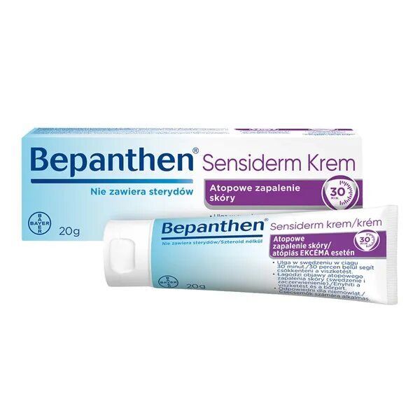 Bepanthen Sensiderm Krem to wyrób medyczny przeznaczony do łagodzenia świądu, zaczerwienienia oraz podrażnień skóry w przebiegu egzemy, atopowego zapalenia skóry (AZS) i reakcji alergicznych. Dzięki technologii lamelarnej wspiera odbudowę uszkodzonej bariery ochronnej skóry, przynosząc szybką ulgę bez stosowania kortykosteroidów.