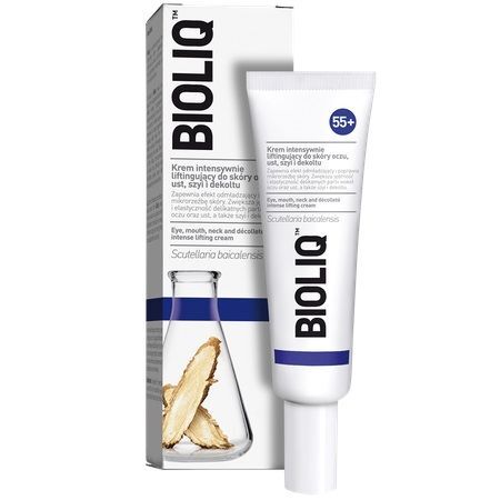 Nanieść niewielką ilość kremu intensywnie liftingującego, Bioliq 55+ na oczyszczoną skórę w okół oczu i ust oraz szyję i dekolt.
