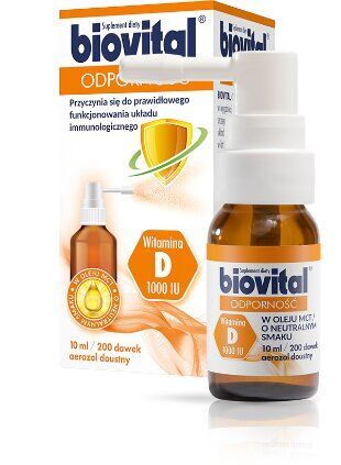 Biovital Odporność to preparat z witaminą D w wygodnej postaci aerozolu, zalecany szczególnie dla osób pragnących wzmocnić swój układ odpornościowy, zwłaszcza w okresach, w których naturalna podaż witaminy D jest niska.