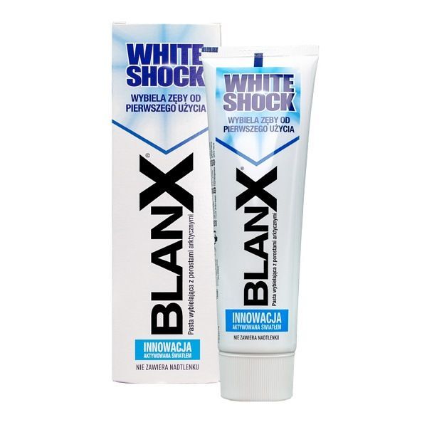 Formuła BlanX White Shock naturalnie wybiela bez użycia rozjaśniaczy optycznych i jest bezpieczna dla dziąseł, gdyż nie zawiera nadtlenku.