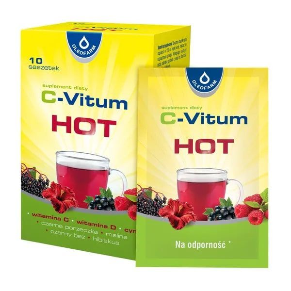 Suplement diety C-Vitum Hot to preparat zawierający w składzie koncentraty z czarnej porzeczki i malin, ekstrakty z owoców czarnego bzu i kwiatów hibiskusa, witaminę D, witaminę C oraz cynk.