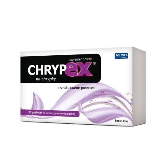 Chrypex, pastylki do ssania na chrypkę o smaku czarnej porzeczki, wspierają łagodzenie chrypki, suchości oraz podrażnienia gardła. Pomagają chronić błonę śluzową i przynoszą ulgę przy nadmiernym obciążeniu głosu.