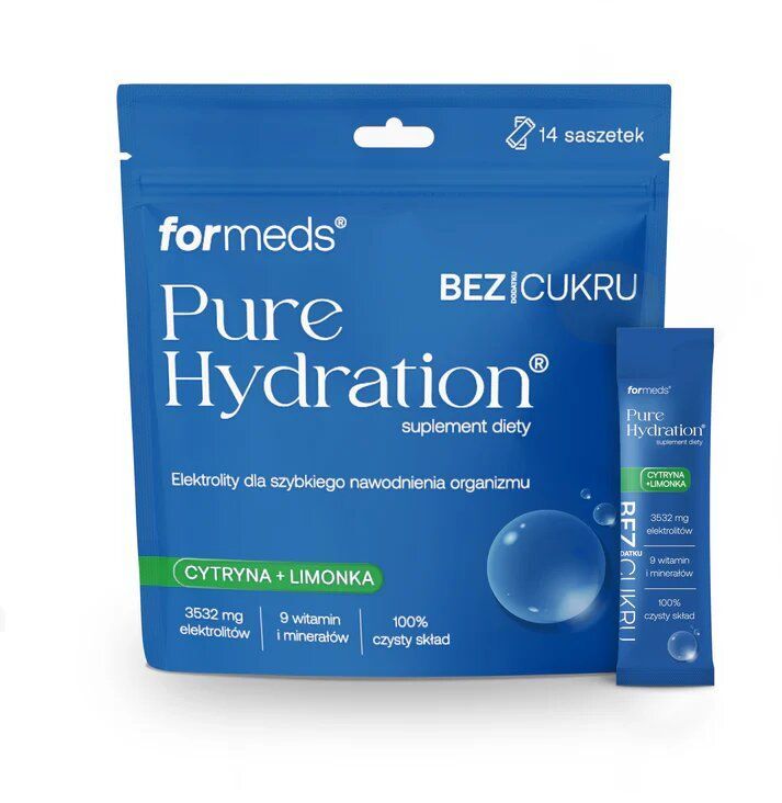 FORMEDS Pure Hydration bez dodatku cukru Cytryna + Limonka to suplement diety w wygodnych saszetkach, który wspiera prawidłowe nawodnienie organizmu. Produkt został opracowany przez markę FORMEDS, znaną z czystych, minimalistycznych składów i wysokiej jakości surowców.