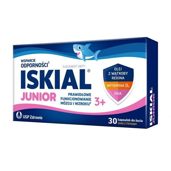 Iskial Junior to suplement diety dla dzieci powyżej 3. roku życia, który wspiera funkcjonowanie układu odpornościowego, wzmacnia organizm i pomaga zapobiegać infekcjom. Preparat wspomaga także prawidłowe widzenie oraz funkcjonowanie mózgu. Dodatkowo przyczynia się utrzymania zdrowych kości. Gwarancją skuteczności suplementu Iskial Junior jest skład bogaty w olej z wątroby rekina, witaminę D oraz kwasy DHA.