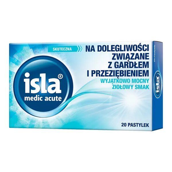 Isla Medic Acute to pastylki do ssania łagodzące dolegliwości związane z podrażnieniem gardła i strun głosowych o wyjątkowo mocnym ziołowym smaku. Przynoszą szybką ulgę podczas przeziębienia, niwelując takie dolegliwości, jak: chrypka, drapanie w gardle, trudności w przełykaniu czy ból gardła.