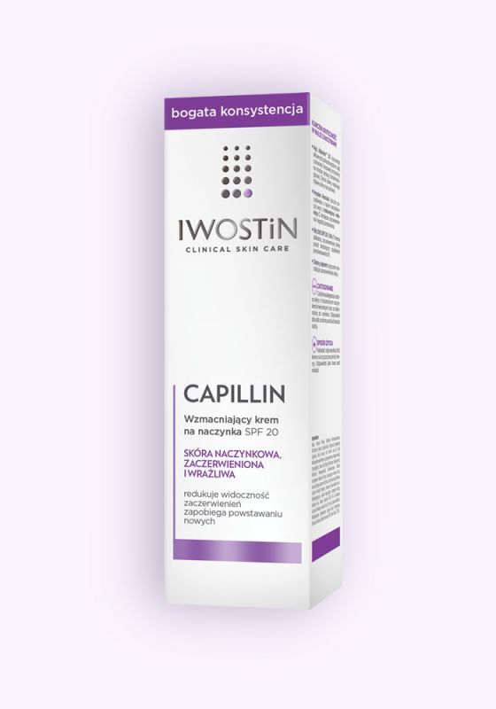 Iwostin Capillin Wzmacniający krem na naczynka SPF 20 o bogatej konsystencji. Produkt przeznaczony jest do codziennej pielęgnacji skóry zaczerwienionej, z widocznymi naczynkami i wrażliwej. Wzmacniający krem na naczynka przywraca skórze naturalny i atrakcyjny wygląd.