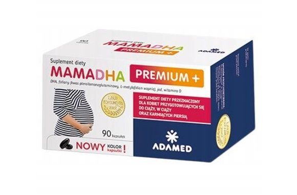 Mamadha Premium + zawiera odpowiednio dobraną kompozycję DHA, witamin i minerałów składników, które wspierają organizm kobiety planującej ciążę, w ciąży i karmiącej piersią oraz prawidłowy rozwój płodu i dziecka karmionego piersią.