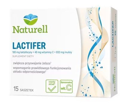 Naturell Lactifer o suplement diety z czystym składem, zawierający laktoferynę wzbogacony o liposomalną witaminę C oraz inulinę do stosowania w celu zwiększenia przyswajania żelaza oraz wspomagania prawidłowego funkcjonowania układu odpornościowego.