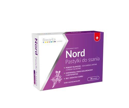 Nord pastylki do ssania to suplement diety zawierający ekstrakt z porostu islandzkiego, wyciąg z dziewanny drobnokwiatowej, kwas hialuronowy i laktoferynę.