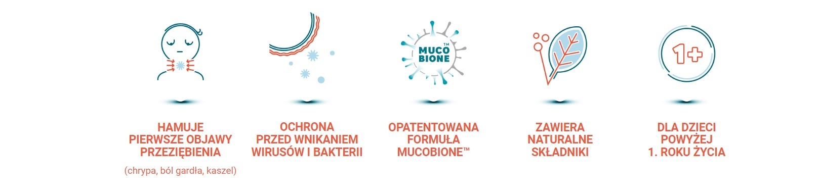 Opatentowana formuła MUCOBIONE™ (wyciąg z korzenia pelargonii afrykańskiej, białko z owsa), wyciąg z plechy porostu islandzkiego, wyciąg kwiatostanu lipy, maltitol, kwas cytrynowy, aromat malinowy, sorbinian potasu, guma arabska, woda.