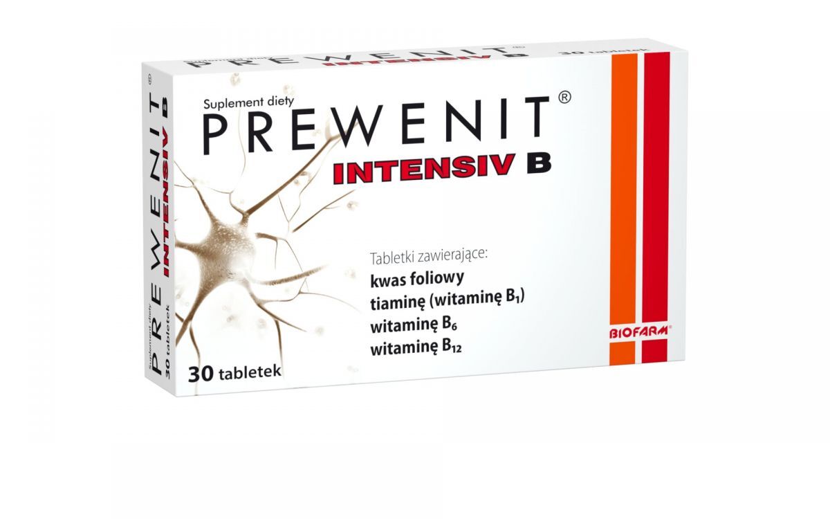 Suplement diety Prewenit® Intensiv B zawiera w swoim składzie kwas foliowy, tiaminę (witaminę B1) oraz witaminy: B6 i B12 dla uzupełnienia codziennej diety.