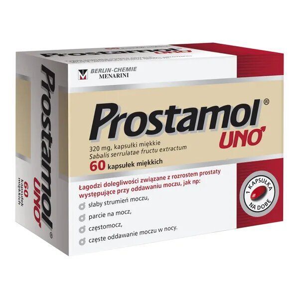 Prostamol Uno 320 mg to lek roślinny stosowany w łagodzeniu objawów związanych z łagodnym rozrostem gruczołu krokowego (prostaty). Preparat zawiera standaryzowany wyciąg z owoców palmy sabal (Serenoa repens), który pomaga zmniejszyć dolegliwości ze strony dolnych dróg moczowych, takie jak częste oddawanie moczu czy słaby strumień moczu.