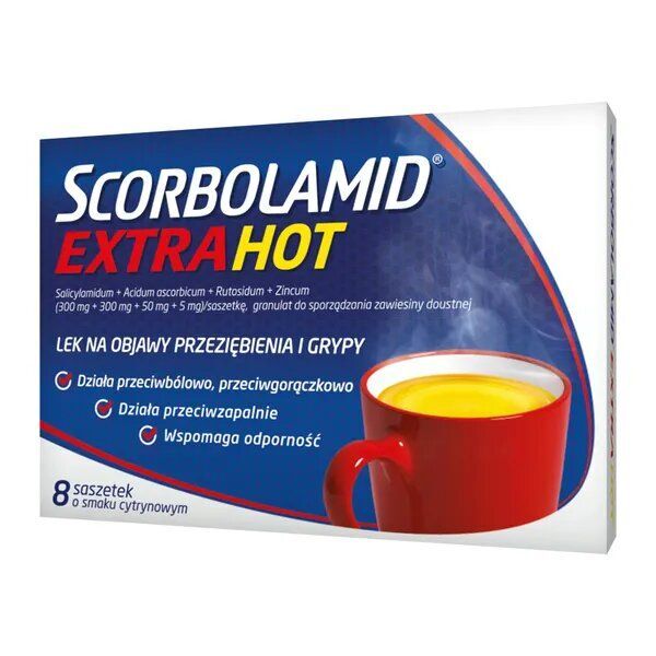 1 saszetka 3 razy na dobę. Wysypać zawartość jednej saszetki leku Scorbolamid EXTRA Hot do pół