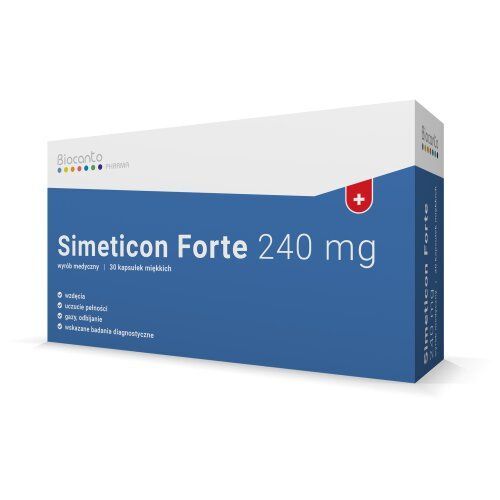 Simeticon Forte 240 mg to wyrób medyczny przeznaczony do stosowania w celu łagodzenia uczucia pełności, uczucia wzdęcia, odbijania, dolegliwości związanychz nadmiernym gromadzeniem się gazów oraz powietrza w przewodzie pokarmowym, które powodują napięcie i ucisk w jelitach. Przeznaczony jest również do stosowania pomocniczo w celu przygotowania pacjentów do badań diagnostycznych jamy brzusznej (ultrasonografii, endoskopii, radiografii i kolonoskopii), w celu usunięcia z przewodu pokarmowego gazów i powietrza, co poprawia jakość uzyskiwanych obrazów.