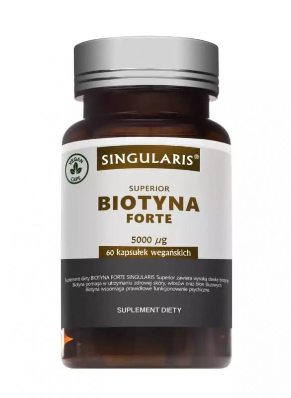 Suplement diety BIOTYNA FORTE SINGULARIS® SUPERIOR zawiera 5000 µg biotyny w jednej kapsułce.