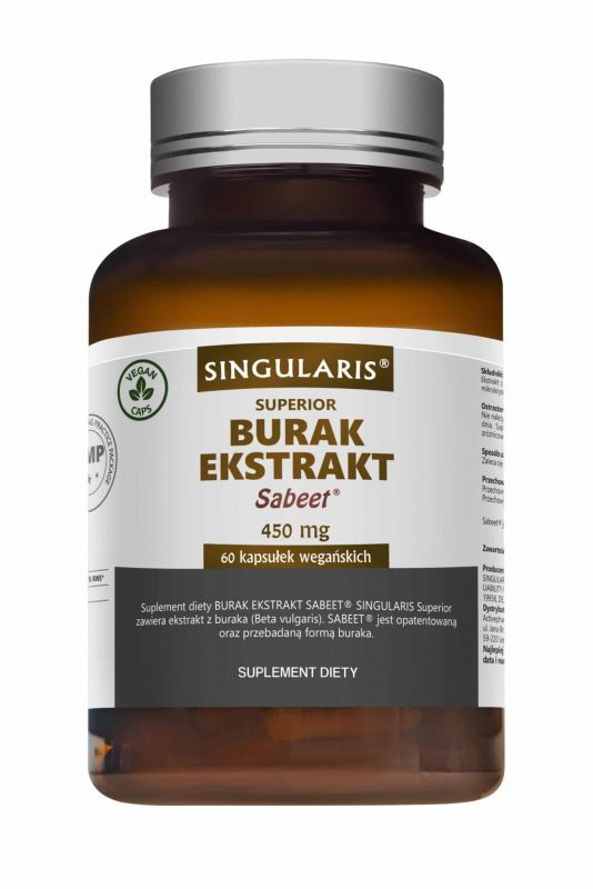 Suplement diety Burak Ekstrakt SABEET® SINGULARIS® Superior zawiera sproszkowany ekstrakt z buraka (Beta Vulgaris) bez z˙adnych dodatko´w. SABEET® jest opatentowana? oraz przebadana? forma? buraka, kto´ry jest bogatym z´rodłem nieorganicznych azotano´w.