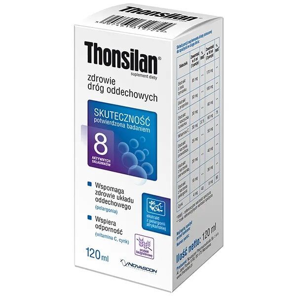 THONSILAN® to suplement diety, który dzięki zawartym składnikom wspiera drogi oddechowe (pelargonia), wpływa łagodząco na jamę ustną i gardło (pelargonia, prawoślaz, tymianek, pierwiosnek, rumianek) i wspomaga prawidłowe funkcjonowanie układu odpornościowego (witamina C i cynk).