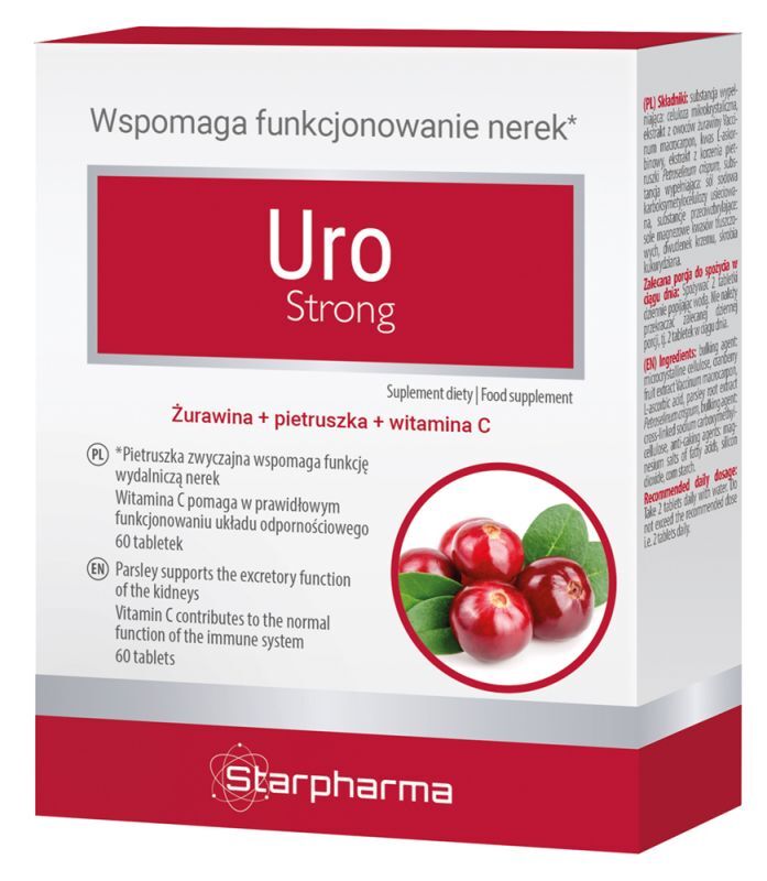 Uro Strong suplement diety zawiera ekstrakt z żurawiny, pietruszki i witaminę C, dzięki czemu: