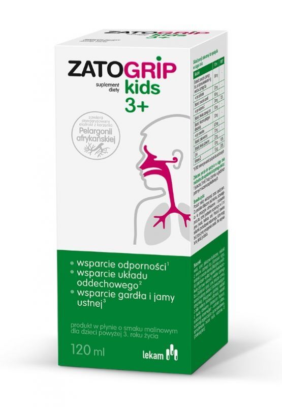 ZATOGRIP kids 3+ to podwójna siła dzięki połączeniu standaryzowanych ekstraktów roślinnych z korzenia pelargonii afrykańskiej oraz owoców czarnego bzu.