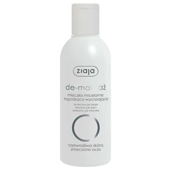 Ziaja De-makijaż mleczko micelarne łagodząco-wyciszające nadaje się do codziennej pielęgnacji skóry nadwrażliwej oraz zmęczonych oczu. Micelarne, łagodząco-wyciszające mleczko sprawdza się w codziennym demakijażu, zarówno twarzy jak i oczu. Łączy w sobie składniki ułatwiające oczyszczanie, łagodne nawet dla wrażliwych oczu oraz substancje kojące dostosowane do delikatnej skóry twarzy. Oczyszcza w jednym etapie, nie zatyka porów, pozostawia skórę, orzeźwioną i wyraźnie nawilżoną. Zawiera naturalne ekstrakty z czarnej jagody i świetlika oraz prowitaminę B5 i alantoinę – znane i sprawdzone substancje łagodzące nadwrażliwość i zmęczenie oczu. Micele, idealnie łączą się z sebum oraz składnikami makijażu, skutecznie je usuwając bez nieprzyjemnego uczucia napinania skóry podczas demakijażu. Mleczko może być stosowane przez osoby noszące szkła kontaktowe. Zostało przetestowane dermatologicznie pod kontrolą lekarzy okulistów, dzięki czemu jest łagodne nawet dla wrażliwych oczu. Nie zawiera kompozycji zapachowej.